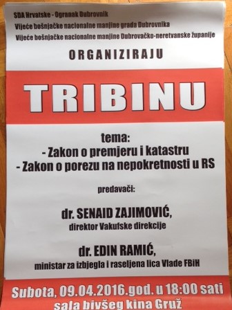 SDA Hrvatske, Vijeće bošnjačke nacionalne manjine Grada Dubrovnika i Vijeće bošnjačke nacionalne manjine dubrovačko-neretvanske županije organiziraju Tribinu na temu: ZAKON O PREMJERU I KATASTRU I ZAKON O POREZU NA NEKRETNINE U RS. Gosti tribine su dr. Senaid Zajimović, direktor Vakufske direkcije i dr. Edin Ramić, ministar za izbjegla i raseljena lica Vlade FBIH.