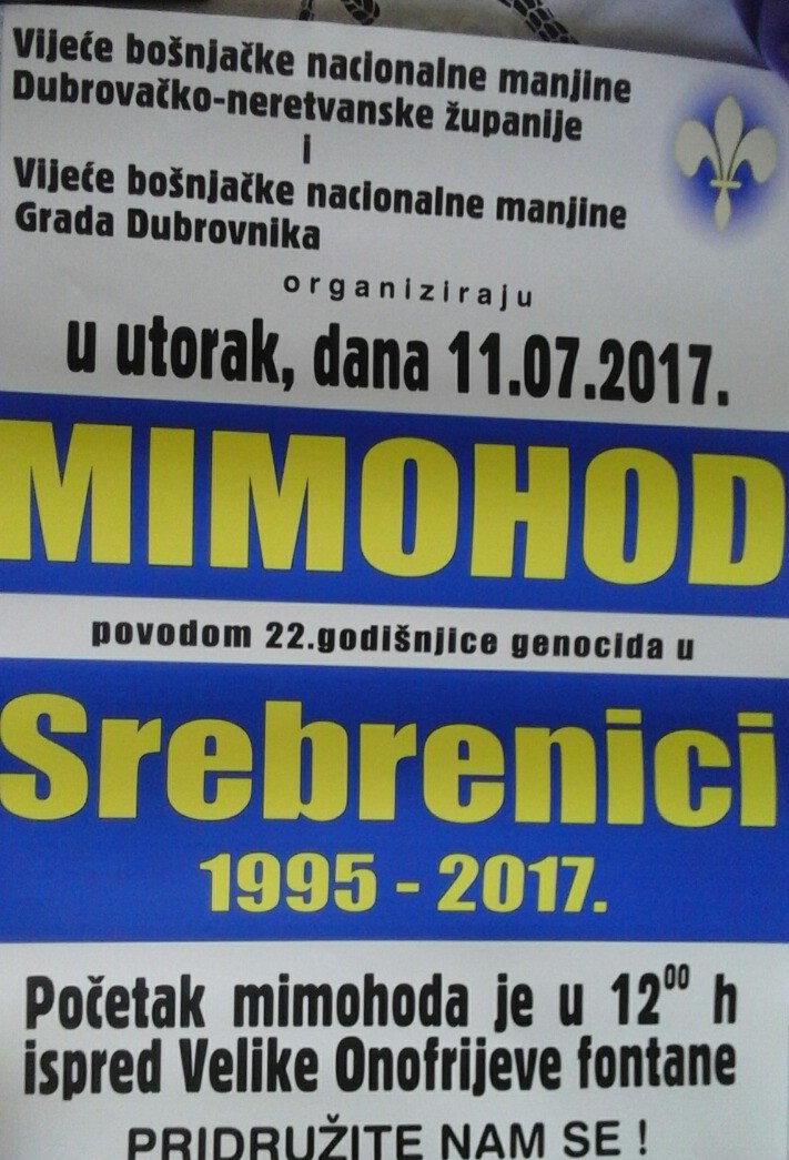 Povodom 22. godišnjice srebreničkog genocida, Vijeće bošnjačke nacionalne manjine dubrovačko-neretvanske županije i Vijeće bošnjačke nacionalne manjine Grada Dubrovnika organiziraju Mimohod sjećanja na Stradunu dana 11.7.2017. s početkom u 12 sati. Prigodne majice sa sve sudionike mimohoda dijeliti će se od 11:30 sati kod velike Onofrijeve fontane.